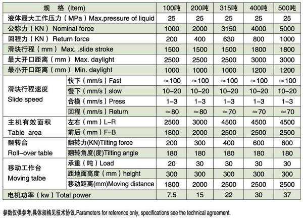 性能特点: 1、本系列机器可根据用户十面需要选用四柱式机型或框架式机型。 2、采用插装阀液压系统,动作灵敏、泄漏少。 3、采用PLC自动控制,能实现点动和半自动操作。具备多重动作联锁,确保操作安全。 4、滑块可在任意位置停止并液压或机械锁紧、确保操作安全。 5、刚性好、精度高,压力、速度、位置控制准确敏捷,满足模具修配的特殊需要。 6、其余主机、电控、液压制作标准参照32系列说明。 选配部件: 上模180度翻转机构、移动工作台、光栅保护、触摸屏、比例压力、速度、位移控制、进口电控、液压、密封元件。 适用领域: 该设备主要适用于汽车、航空、家电等行业中大型模具的研配、调试和试模,亦可满足其他压力成型工艺的需要。 性能参数:
