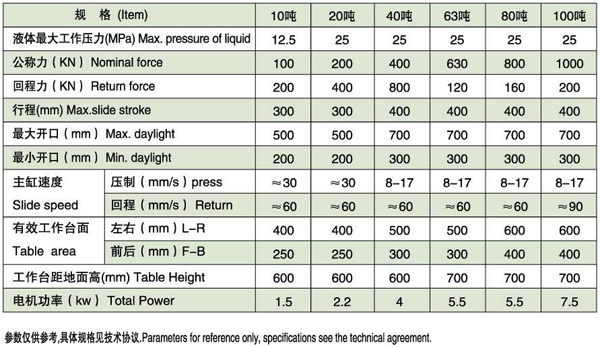 性能特点: 1、采用双立柱结构,造型简单、操作方便、成本低。 2、整机采用钢板焊接,并经回火处理,确保长期使用的机身精度。 3、油缸下行配备活动梁导向,防转、抗偏载。 4、采用板式集成油路、使用寿命长、液压冲击小、泄漏少。 5、采用按钮集中控制,具有点动、半自动的操作方式,可实现定程和定压两种成型工艺。 6、滑块的工作压力、工作行程等均可根据工艺需要进行调整。 适用领域: 适用于可塑性材料的压力成型,可满足简单金属零件的拉伸、弯曲、压印、成形、落料等工艺,也可以进行一般粉末、塑料制品的压制或其他相关的压力成型工艺。 可选配件: PLC、进口电气、液压、密封元件、手动或脚踏操作、安全光栅、防护网等。 技术参数:
