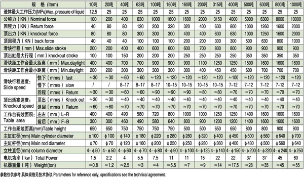 性能特点: 1、本系列机器为标准三梁四柱式机型,配备主缸、顶缸。 2、具备独立的电控和液压系统,采用按钮集中控制,能实现点动和半自动操作。 3、工作压力、工作行程可在一定范围内根据需要进行调整。 4、40-500吨主机三梁采用铸件,其余采用焊接件,均经回火处理。 5、油缸体及活塞杆均为高强度锻件,确保性能。缸体内壁经滚压处理,活塞杆及立柱调质、淬火、镀铬。 6、液压系统采用二通插装阀,动作可靠,简单紧凑,泄漏少。 7、液压系统配备多级过滤装置,确保系统无故障运行。 8、液压管道均以高压软管,充分消除震动和冲击,降低泄漏的可能。 9、电控系统定程、定压功能齐全,顶出、拉伸及不带顶缸三种底部成型工艺可供选择。 10、电控系统的关键电器元件均为欧姆龙、西门子、施耐德,确保长期可靠使用。 11、双手启动、紧急停止、紧急回程、短路漏电保护、自动程序互锁的安全保护电路。 适用范围:: 适用于可塑性材料的压制工艺。如冲裁、弯曲、翻边、薄板拉伸等,也可从事校正、压装、冷热挤压、塑料制品及粉末制品的压制成型。 可选配件: 1、PLC自动控制 2、触摸屏操作 3、移动工作台或液压换模轨道 4、液压系统加热或冷却装置 5、外部模具加热或冷却装置 6、安全保护光栅 7、防护网或防护罩 8、工作灯或电源插座 9、压力、位移、行程数显装置 10、冲裁缓冲装置 11、打料装置(液压或机械) 12、进口液压、电控、密封元器件 技术参数: