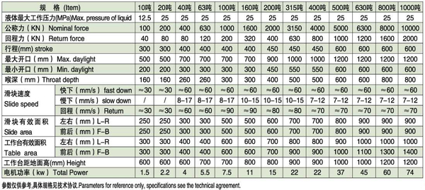 性能特点: 1、采用有限元优化结构设计,C型单臂式机身结构,刚性好,结构简单、操作方便。 2、整机采用钢板焊接,并经回火处理,确保长期使用的机身精度。 3、活动梁采用四柱导向,防转、抗偏载能力强。 4、液压系统装于机内,采用二通插装阀集成系统,动作可靠、使用寿命长、液压冲击小、泄漏少。 5、独立的电气与液压控制系统,工作可靠、动作直观、维修方便。 6、采用按钮集中控制,具有点动、半自动的操作方式,可实现定程和定压两种成型工艺。 7、滑块的工作压力、空载快速下行和慢速工进的形程范围均可根据工艺需要进行调整。 适用领域: 适用于轴类和型材的校正,轴套类零件的压装、板金件的弯曲、整形、切边等工艺。亦可满足其他金属或非金属零件压力成型的需要。 可选配件: 校正工作台、进口PLC、手动或脚踏操作、悬臂式起吊葫芦、安全光栅、防护网 技术参数: