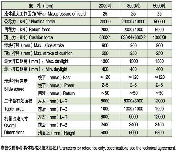 性能特点: 1、机床有单机和双机联动两种形式。 2、机床三梁多柱结构,三梁经整体回火,刚性高,精度保持性好。 3、机身采用多柱式结构,立柱表面经中频淬火处理,强度好、硬度高,耐磨抗拉伤。 4、配备大流量插装阀液压系统和相应的比例位移、速度、压力元件,采用三菱PLC+触摸屏控制,通过触摸屏实现压力、速度、位置的显示、设定和控制。 5、具备点动和半自动功能,能实现定压和定程两种方式,具有保压延时和自动返程功能。 6、整机运行采用进口传感器检测发讯,闭环控制,电液比例执行,多缸同步效果好,滑块抗偏载能力强。 7、机床设有双手操作、多处急停,过载保护、偏载保护、安全护栏等安全措施。 8、其余主机、电控、液压制作标准参照32系列说明。 适用领域: 适用于汽车纵梁成型工艺,亦可从事其他金属薄板压制成型以及校正等工艺。 选配部件: 1、上打料机构,下液压垫、换模升降导轨、移动工作台等。 2、框架式结构的。 3、进口电控液压密封元件。 技术参数: